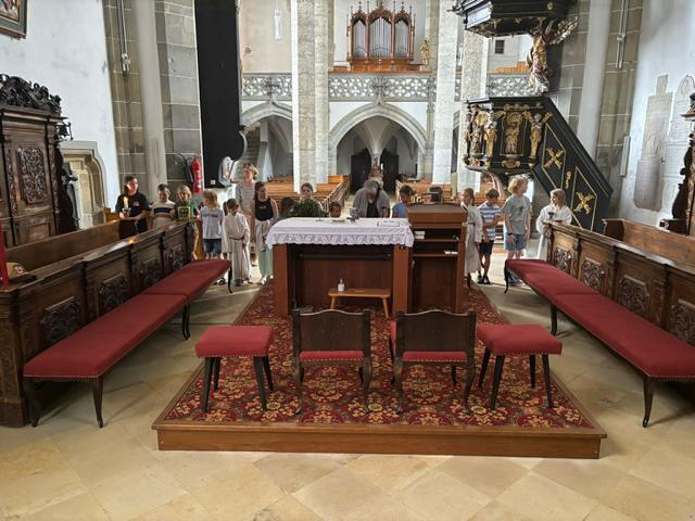 Der Gottesdienst am Pfingstsonntag in der Weiklhalle war trotz Regenwetter gut besucht. Sr. Berta überreichte am Ende des Gottesdienstes „Blumen“ mit Pfingstwünschen, die an die Kraft der Erneuerung und des Miteinanders erinnern. Musikalisch sorgte der Kinderchor, unter der Leitung von Theresa Pohn, für eine fröhliche, lebendige Stimmung.