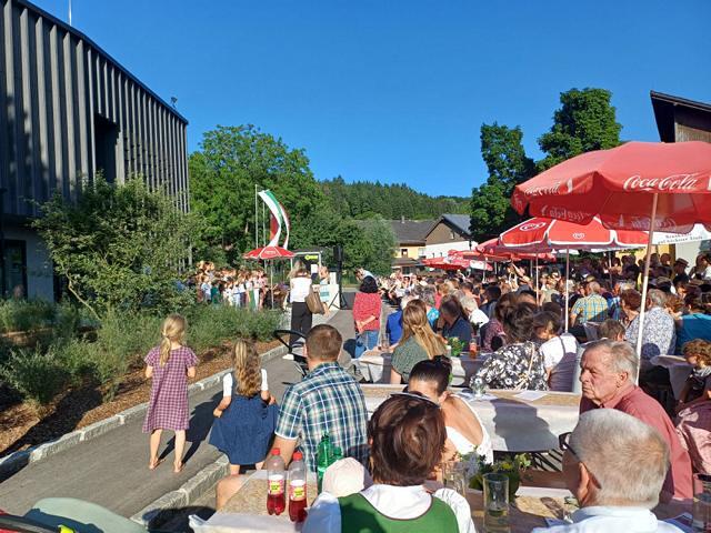 Erstmals fand die anschließende Bewirtung am neu gestalteten Dorfplatz zwischen Kirche und Gemeindezentrum statt. Die laue Sommernacht, das stimmungsvolle Ambiente und die schöne Gemeinschaft luden zum Verweilen ein - viele blieben bis in die späten Abendstunden sitzen.