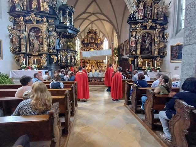 Trotz der sommerlichen Hitze machten sich gestern zahlreiche Wallfahrerinnen und Wallfahrer aus den umliegenden Pfarren auf den Weg nach Zell zur traditionellen Sternwallfahrt. Die von Ute Huemer aus Ottnang vorbereitete Festpredigt wurde kurzfristig von Susanne Grurl, Pfarrassistentin in Ungenach, übernommen. Ein herzliches Dankeschön dafür, da Ute Huemer leider krankheitsbedingt absagen musste. Die musikalische Gestaltung des Gottesdienstes kam heuer ebenfalls aus Ungenach: Danke an den Kirchenchor unter der Leitung von Alois Watzinger.